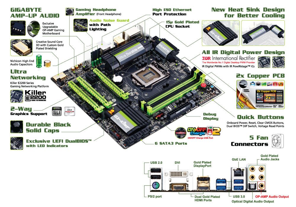 GIGABYTE G1-Killer motherboards feature the Killer(TM) E2200 from Qualcomm Atheros, a high-performance, adaptive gigabit Ethernet controller that offers better online gaming and online media performance compared to standard solutions. The Killer(TM) E2200 features Advanced Stream Detect technology, which identifies and prioritizes all network traffic to ensure important applications that require high-speed connectivity are prioritized over less important traffic.