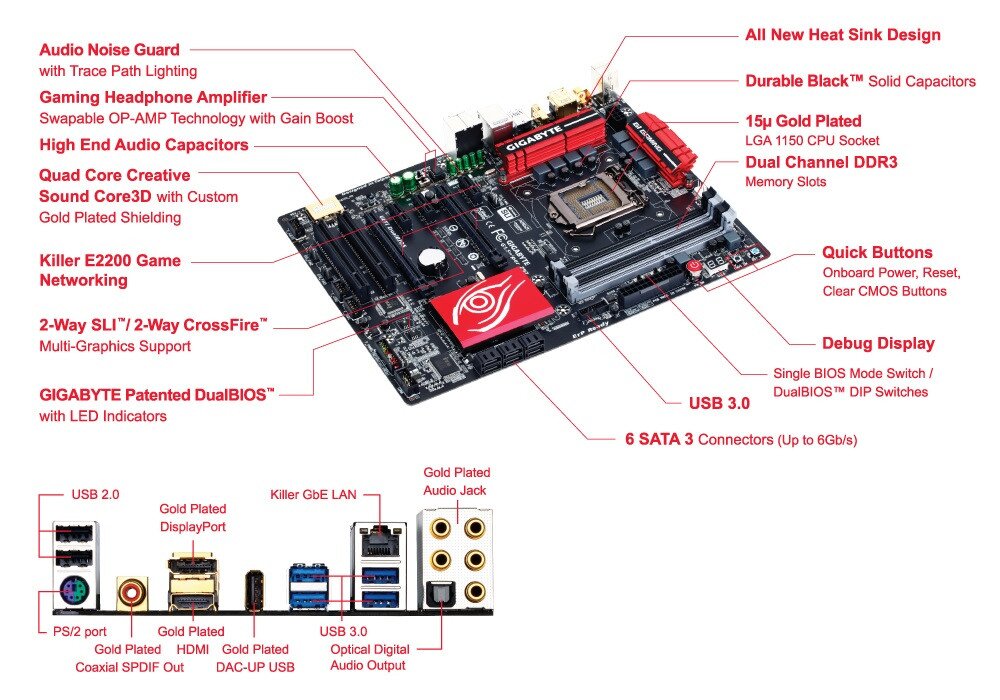 GIGABYTE G1(TM) Gaming motherboards pack top quality gold plated audio and HDMI connectors for improved connectivity and long lasting durability. Gold has superb signal conductivity and will not tarnish over extended periods of use. The Creative Sound Core3D(TM) processor is also shielded by a gold plated cover which eliminates electrostatic interference.