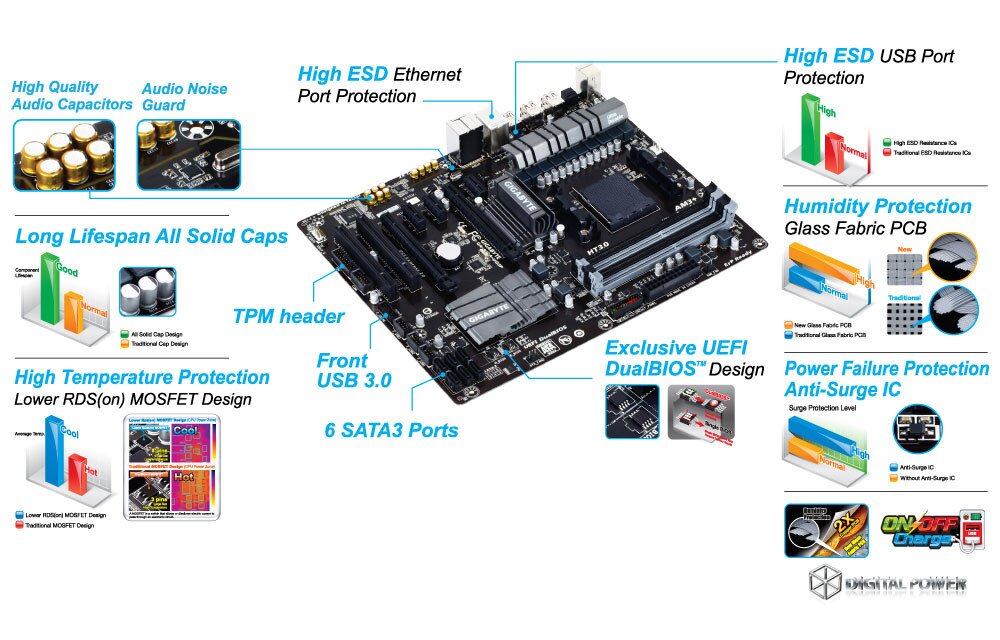 GIGABYTE uses All Solid Caps (Capacitors) and Low RDS(on) MOSFETs which are rated to work at higher temperatures.