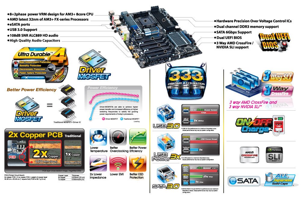 GIGABYTE motherboards feature GIGABYTE 333 Onboard Acceleration , a range of the latest technologies that are designed help speed up data transfer, including SuperSpeed USB 3.0 technology, SATA Revision 3.0 (6Gbps) technology and an unprecedented 3x USB power boost on USB ports for more power hungry USB devices.