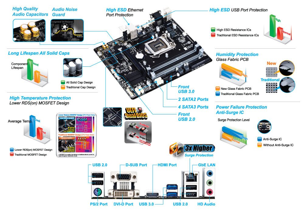 GIGABYTE 8 Series motherboards raise the bar in terms of protecting your system, providing advanced electrostatic discharge (ESD) protection for both your Ethernet LAN and USB ports, both common sources of ESD-related failures. Each LAN and USB port is paired with a dedicated protection filter that can withstand high electrostatic discharges, protecting your system from common electrical surges and even direct lighting strikes.