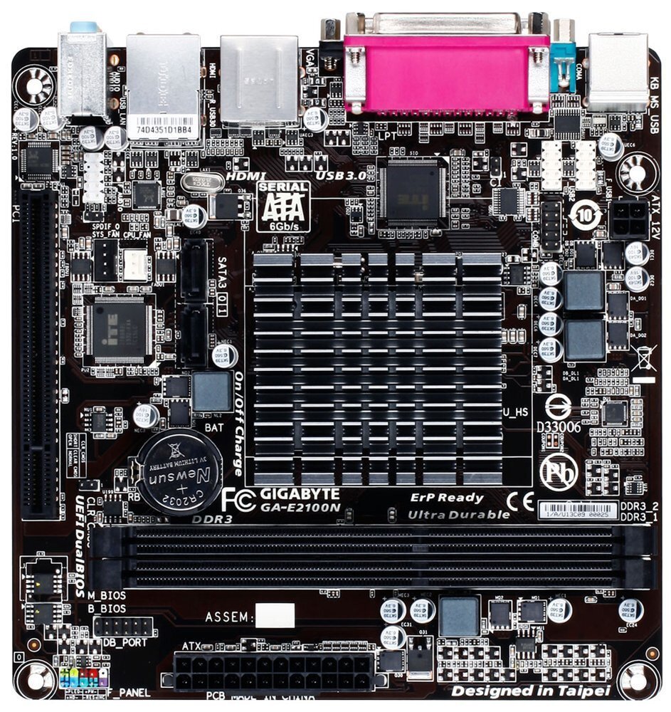The GIGABYTE E2100N Mini-ITX motherboard is a fully integrated PC motherboard featuring the AMD Dual Core E1-Series APU with Radeon HD 8210 graphics (DX11). Designed for compact, small form factor PC systems and devices, the GIGABYTE E2100N is entirely fanless, making it ideal for always-on, mission critical systems, as well as noise-sensitive digital entertainment systems. Connectivity includes digital and analog display outputs via HDMI and VGA ports, while the HDMI port offers native support for 4K resolution displays.