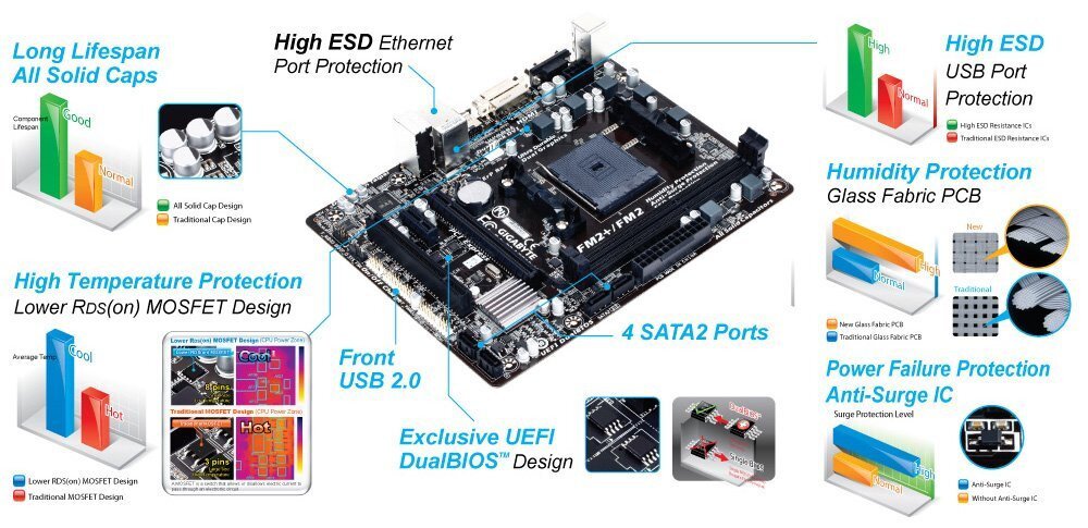 GIGABYTE uses Solid Caps (Capacitors) for APU VRM and Low RDS(on) MOSFETs which are rated to work at higher temperatures to provide a longer lifespan.