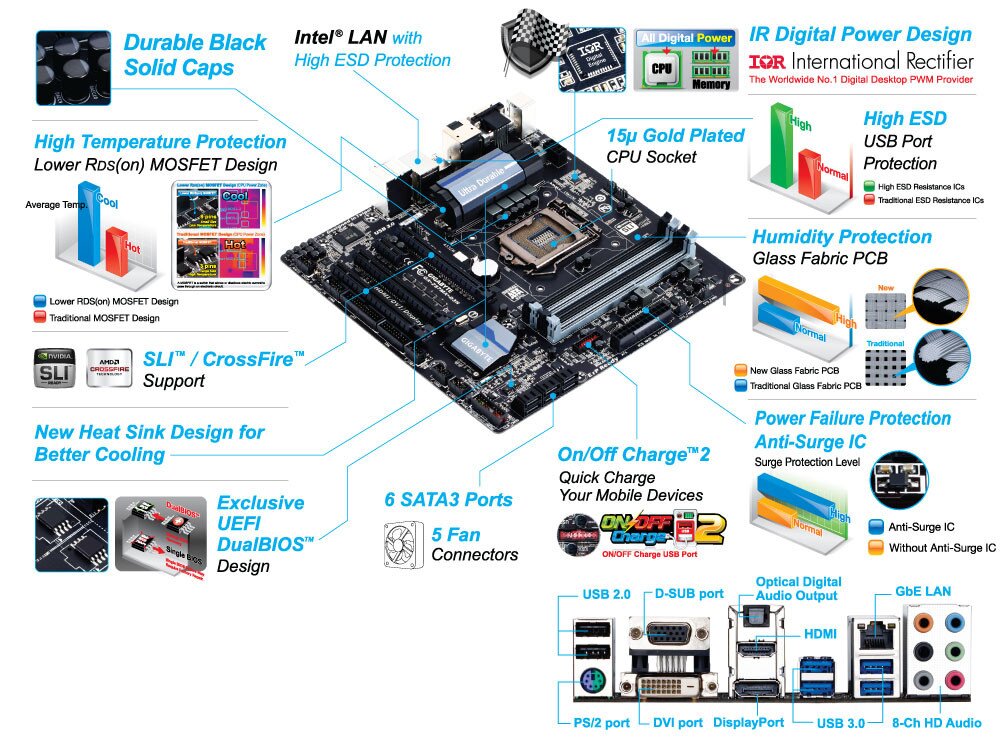 GIGABYTE 8 Series motherboards raise the bar in terms of protecting your system, providing advanced electrostatic discharge (ESD) protection for both your Ethernet LAN and USB ports, both common sources of ESD-related failures. Each LAN and USB port is paired with a dedicated protection filter that can withstand high electrostatic discharges, protecting your system from common electrical surges and even direct lighting strikes.