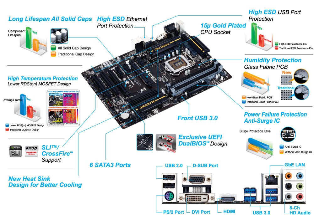 GIGABYTE 8 Series motherboards raise the bar in terms of protecting your system, providing advanced electrostatic discharge (ESD) protection for both your Ethernet LAN and USB ports, both common sources of ESD-related failures. Each LAN and USB port is paired with a dedicated protection filter that can withstand high electrostatic discharges, protecting your system from common electrical surges and even direct lighting strikes.