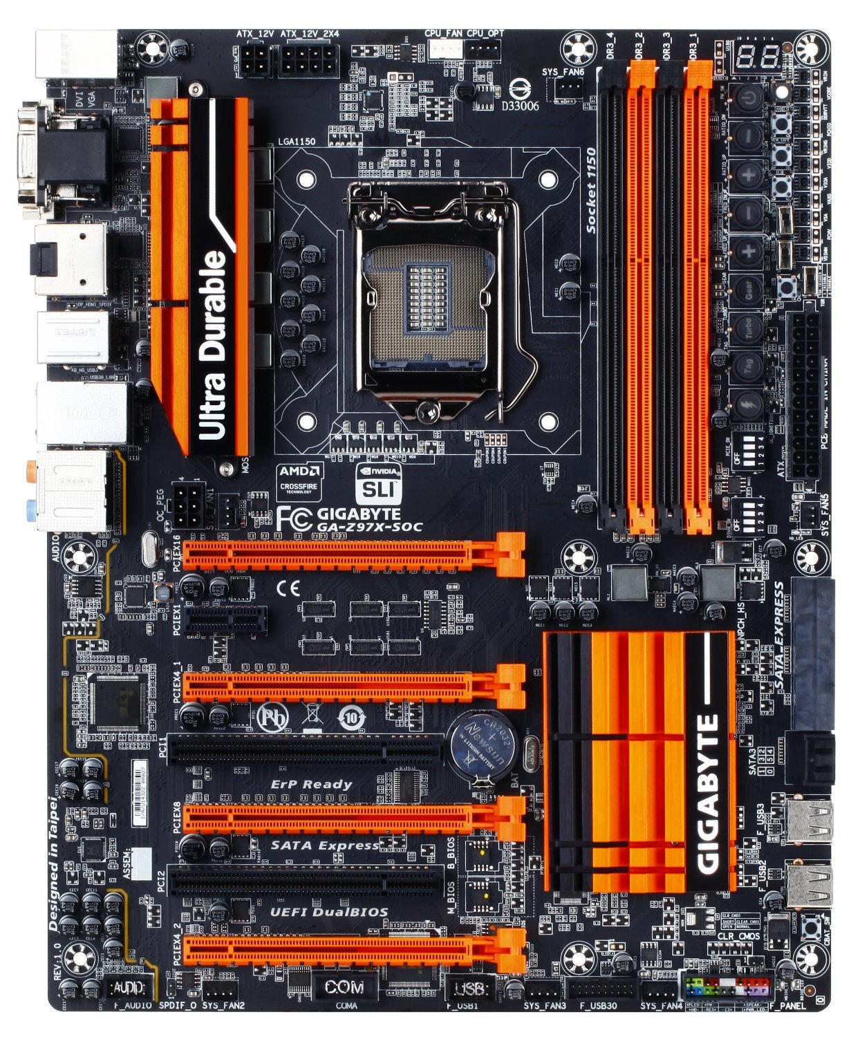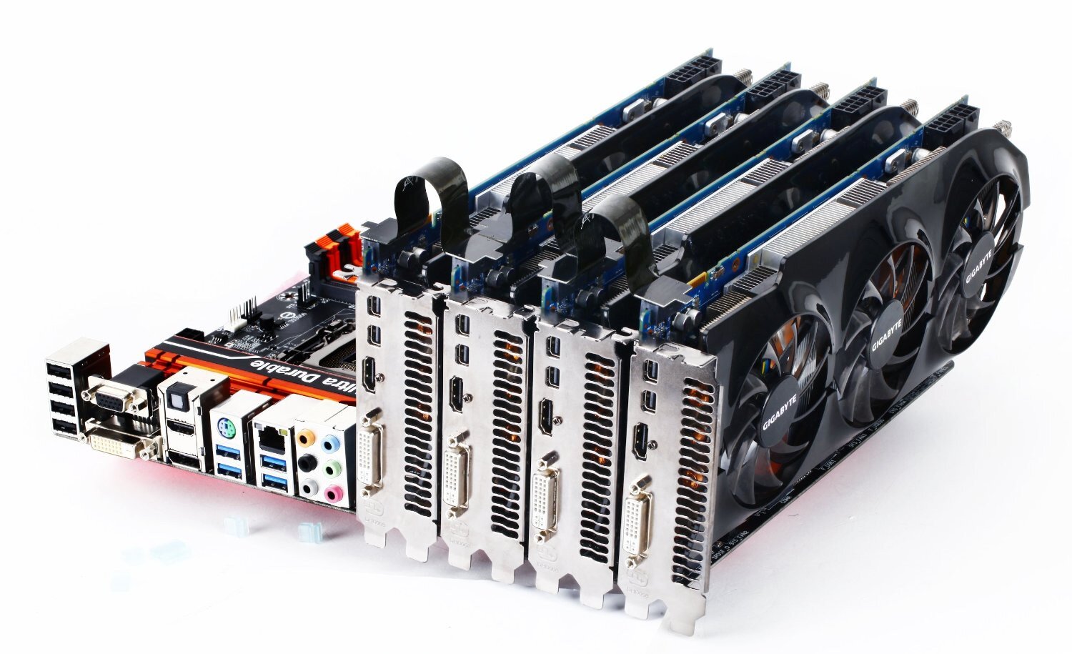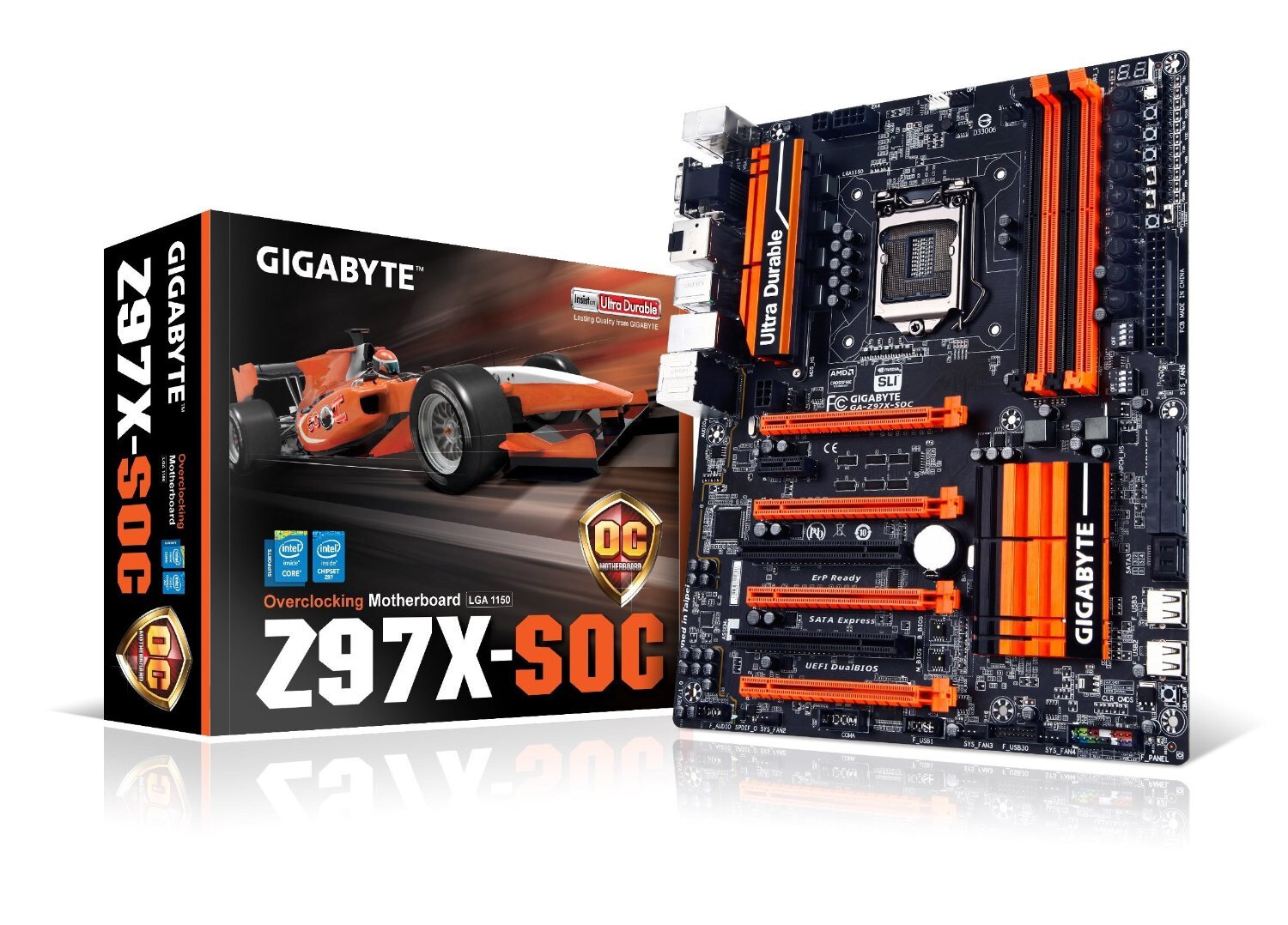 GIGABYTE 9 series overclocking motherboards feature optimized support for AMD CrossFire(TM) in 4 way configuration plus support for Nvidia SLI technology in 2-way setups. This extreme design allows a more optimized multiple-card overclocking experience where the first 3 slots have the data bandwidth available from trace paths direct from the CPU and the fourth slot taking PCIe lanes from the Intel(R) Z97 PCH.