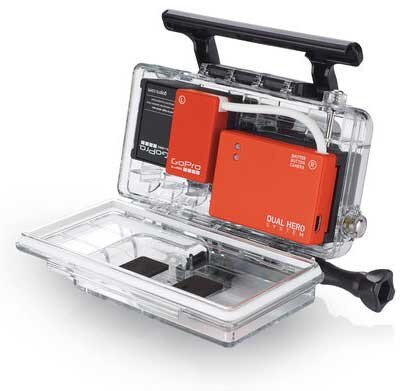 Capture a wide variety of content with the Dual HERO System. The tandem housing holds two HERO3+ Black Edition cameras1, enabling you to capture full-resolution video and photos simultaneously with uncompromised image quality. You can also record synchronized footage to convert to 3D using GoPro Studio editing software, available via free download here. Single interface control allows one camera to control the other's settings and modes for convenient shooting. Waterproof to 197' (60m).