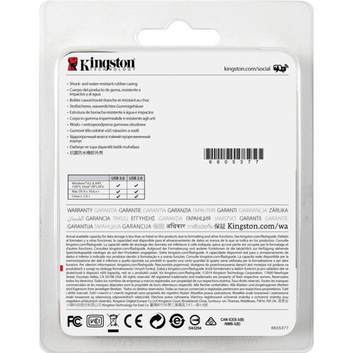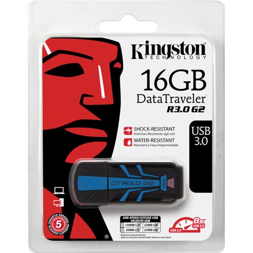 The 16GB DataTraveler R3.0 G2 USB 3.0 Flash Drive from Kingston provides 16GB of secure data storage for photos, videos, music, and more. It delivers USB 3.0 high-speed performance with 120MB/s read speeds and 25MB/s write speeds, to save time when transferring files. It is 8 times faster than a standard 2.0 drive and saves an estimated 20 minutes when transferring a 1080p full HD video. Its speeds alleviate transfer bottlenecks when storing or viewing HD video, music libraries, digital artwork, presentations, and other large files. The DataTraveler R3.0 G2 features a rugged, rubberized casing, and is certified for shock and water resistance, so it can withstand knocks and bumps without damage while on the go. It is backwards compatible with USB 2.0 ports.