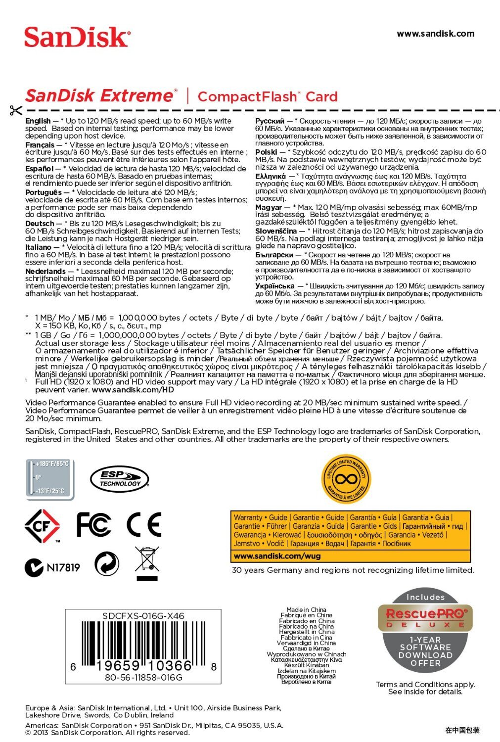 SanDisk Extreme CompactFlash Memory Cards are designed to handle whatever life throws at you. This card is backed by rigorous stress, shock, and vibration testing and includes RTV silicone coating for protection against shock and vibration. It operates in nearly any climate, with a functioning temperature range of -13 to 185 degrees Fahrenheit.