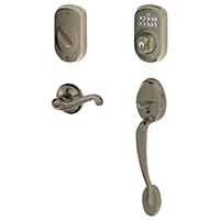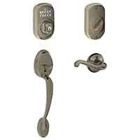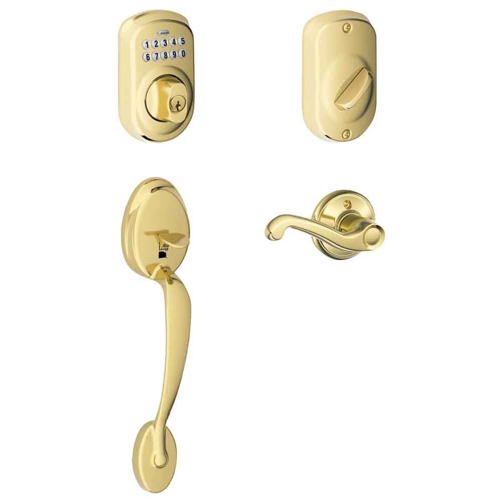Discover Schlage Keypad Deadbolt with Plymouth Trim Paired with Plymouth Trim Handleset and Flair Lever
