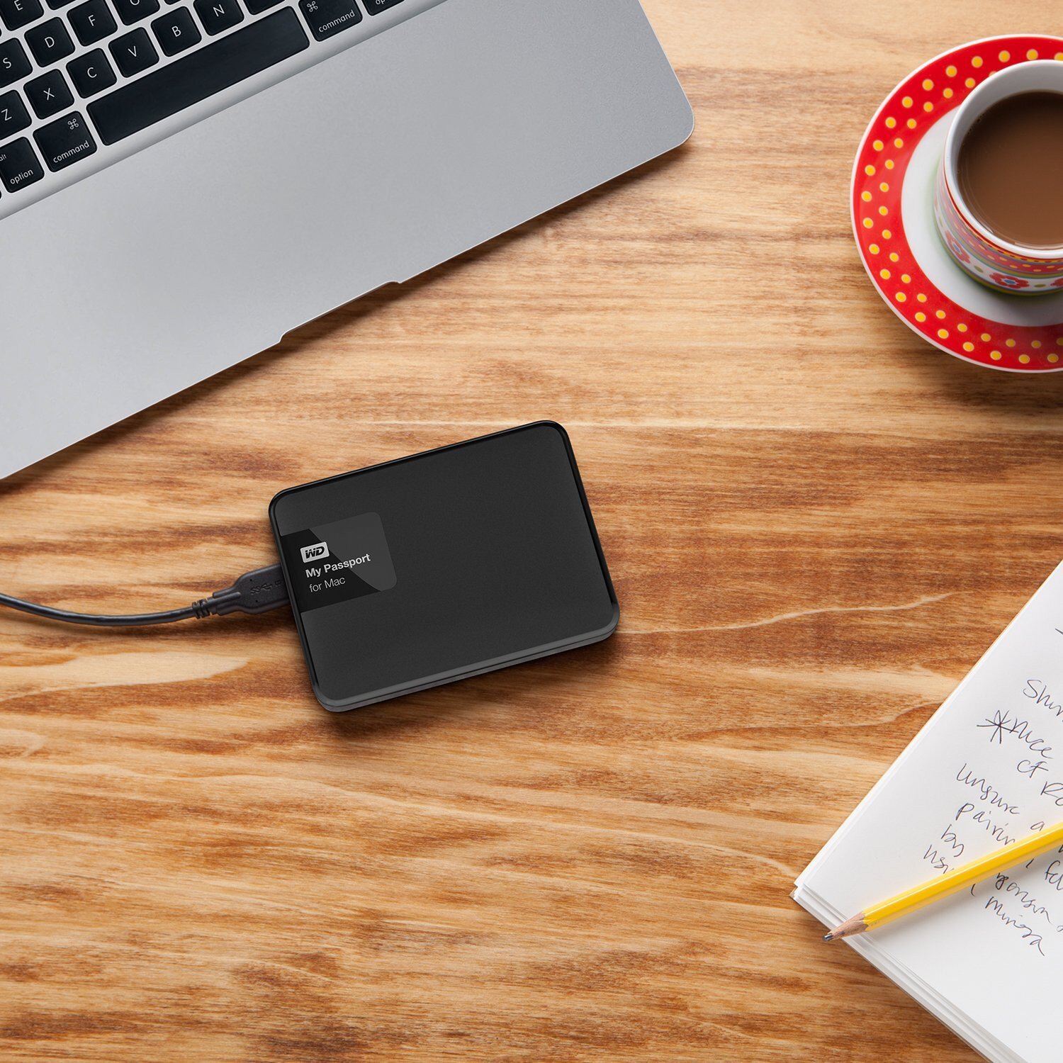 The My Passport for Mac device helps to safeguard your creative life with password protection, 256-bit AES hardware encryption, and Apple Time Machine compatibility.